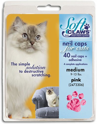 Product Description Soft Claws Nail Caps are a simple alternative to declawing when pet scratching is a problem. They are easy to apply and are perfect for cats of all ages. Soft Claws do not interfere with the normal extension and retraction of your cats claws. When applied to front paws, they reduce the potential for damage due to our cat's natural clawing and sharpening behavior. Kit contains: 40 nail caps, 2 tubes adhesive and glue applicator. Sizes: Kitten, small, medium and large and in color choices of purple, pink, clear, blue and red. Kitten comes in clear only. Most average size cats wear medium. If your cat is very small boned, choose the small size. Very large boned cats tend towards large. Kittens ususally are big enough to wear soft claws by 12 - 16 weeks of age. Directions: To test, try a nail cap on first without the adhesive. If it looks too big, don't glue it on. The nail cap should fit snugly, like a glove. The nail caps can also be trimmed to fit if needed. Kittens up to about 5 months of age and 5 pounds body weight generally fit into the kitten size.