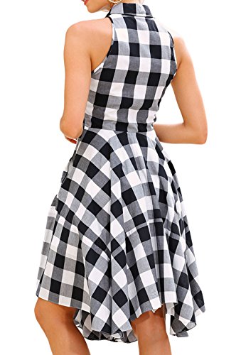 Chic and modest black white gray check patterns all over. You've got the perfect hourglass figure in this collared shirtdress with billowy pleats, button front bodice, side seam pockets and handerchief hem to complete your look. Finish your look with statement accessories and strappy wedge sandals Package Includes: One Piece Causal Dress Other accessories are not included