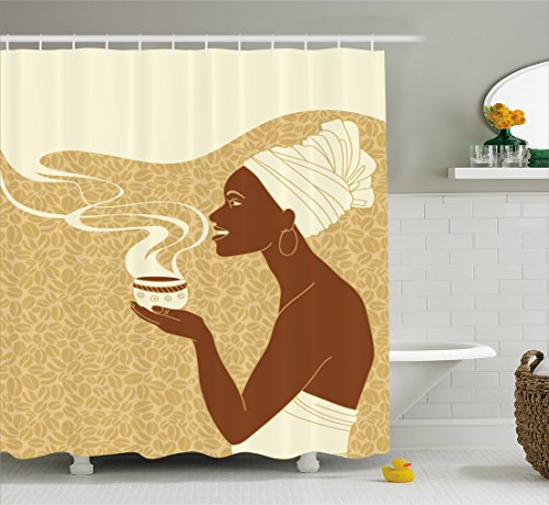 African Woman Shower Curtain by Ambesonne, Smiling Happy Afro Lady with Hot Coffee Cup Seeds Cocoa Vintage, Fabric Bathroom Decor Set with Hooks, 84 Inches Extra Long, Brown Light Brown Cream