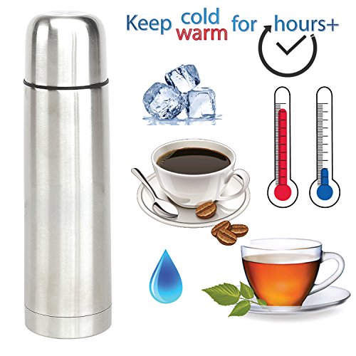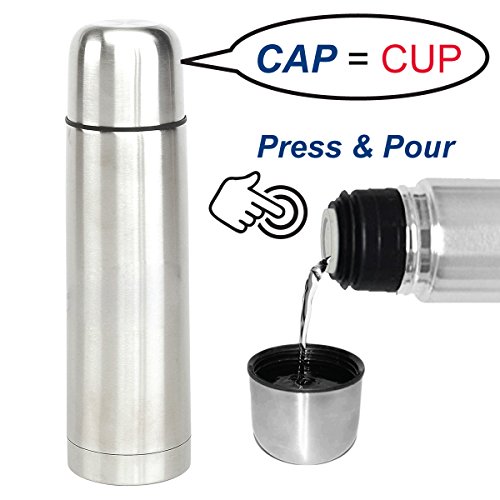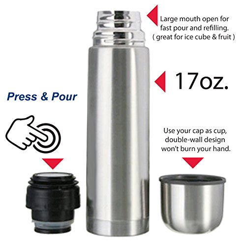 Studio : BuyAgain Publisher : BuyAgain Product Description 17 oz Thermos Double wall stainless steel vacuum insulated bottle. Sleek design that easily fit into cup holders. Constructed with double wall stainless steel keeping the drink hot or cold for hours, perfect for beverages on the go. Simply push and pour making it easy to use. The twist off cap serves as your cup. Enjoy your beverage anywhere without having to carry an additional cup. Thermos bottle is designed leak proof to prevent any spill. 0