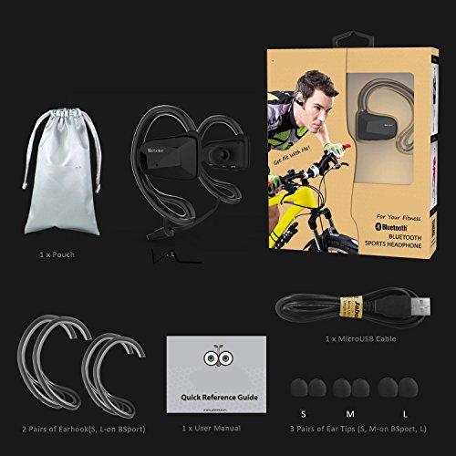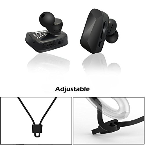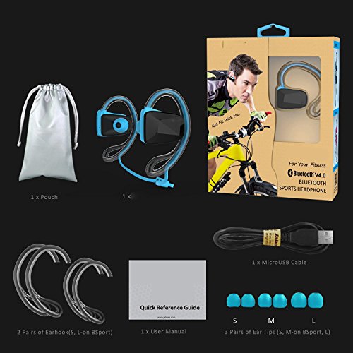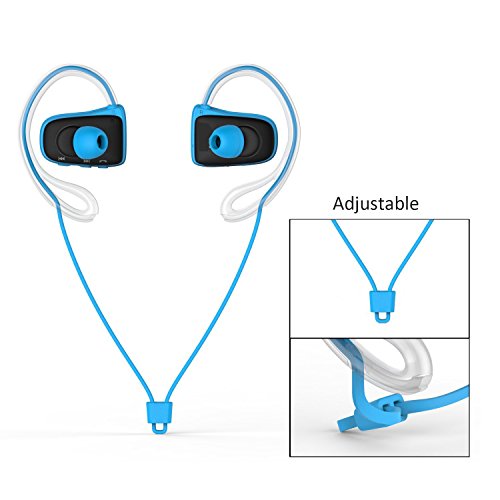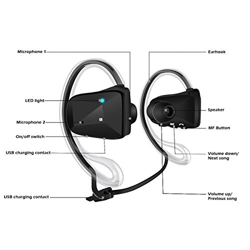 -. Feature : Comfort Fit for Workout:Soft and Removable design,strap is adjustable.Your ultimate comfortable choice for wireless music and call when training.item is very compact(20g),you will not feel uncomfortable to wear it up. / Sweat proof:Waterproof testing,Immersion in water beyond 1 meter,take out Immediately;water splashing from any direction--No Harmful effect.So go ahead,move,sweat and rock hard,Running In the Rain. / Enjoy High quality music:Bluetooth 4.0 and aptX technology,Delivers CD-quality wirelessly over bluetooth from iphone 6 iphone 6s,samsung or other.Good sound insulation,stereo bass,6 hours for music.I love it.you also can love it. / High connection strength:Quickly and easily pairing and connection through the in-built NFC.it can connected when you turn it on.Not easy to lose connection.I test many,it has noise;or lose connection when you put your phone in the bag or your back pocket. / Handsfree,Good for driving or sporting:Dual,high-performance mics deliver superb noise cancellation,so calls come in crystal clear.You just need to press on button