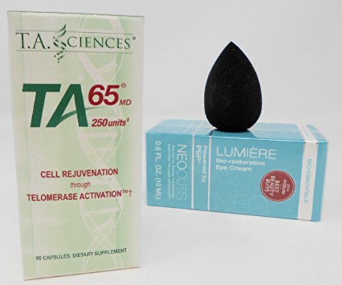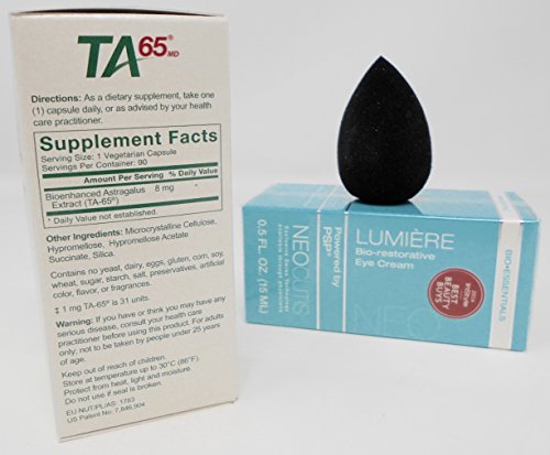 T.A. Sciences, TA-65 250 Units, 90 Capsules by T.A. Sciences, Lumiere Bio-restorative Eye Cream with PSP, Anti-aging, 0.5 Ounce Vantage Point Trading Anti-Aging Cosmetic Blender Sponge Bundle. We all want to feel young. You may be a person who eats well, exercises, takes supplements and has a generally healthy lifestyle. But we all know that is still not enough. We see healthiest people continue to age and deteriorate. Scientific research has discovered that a primary cause of aging is shortening of the telomeres - the protective end-caps of DNA at both ends of every chromosome. You can fight telomere shortening with diet and exercise, but only up to a point. But now you can fight it with telomerase activator- TA-65. Telomerase activation in aged or chronically stressed normal cells has been shown to slow or reverse telomere shortening, increase replicative capacity and restore or improve cellular function Neo Cutis Lumiere-This gentle eye cream works to reduce the appearance of dark circles and puffiness with caffeine, bisabolol and sodium hyaluronate, in combination with the effective complex, psp. or processed skin proteins, is a naturally balanced blend of essential nutrients, such as growth factors, antioxidants and matrix proteins, including collagen. this powerful ingredient revives skin, causing it to become softer, firmer, younger- and healthier-looking. fragrance- and colorant-free, lumiere bio-restorative eye cream with psp is ultra-gentle for the delicate eye area. the skin around the eyes is left softer, stronger and younger-looking. Free Lumiere Bio-restorative Eye Cream with PSP 0.5 oz. anti aging bundle.Feature
