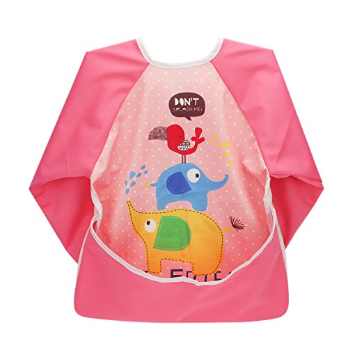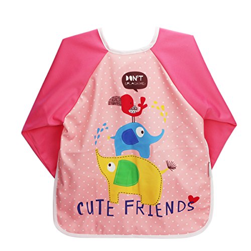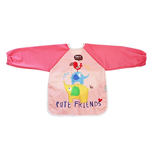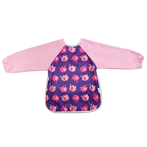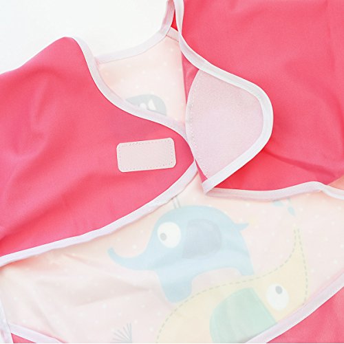 Hi Sprout Unisex Infant Toddler Baby Super Waterproof Sleeved Bib, Reusable Bib with Sleeves& Pocket, Multi Patterns, 6-24 Months (pink elephant)