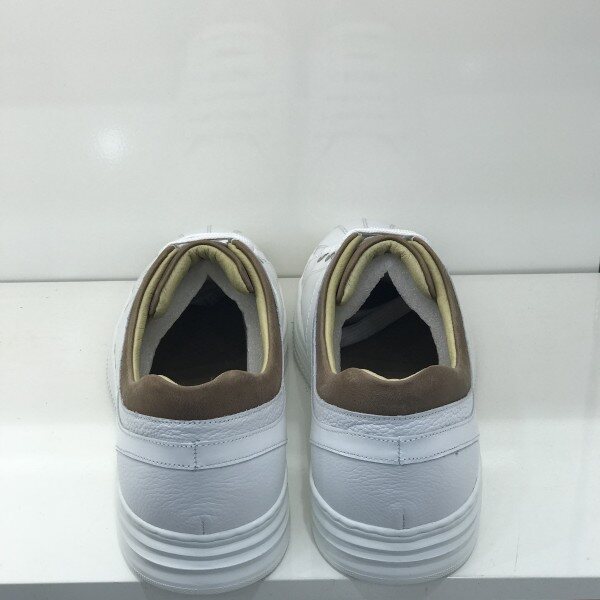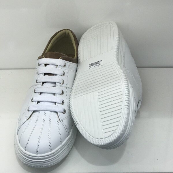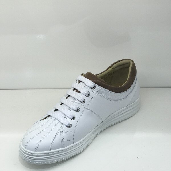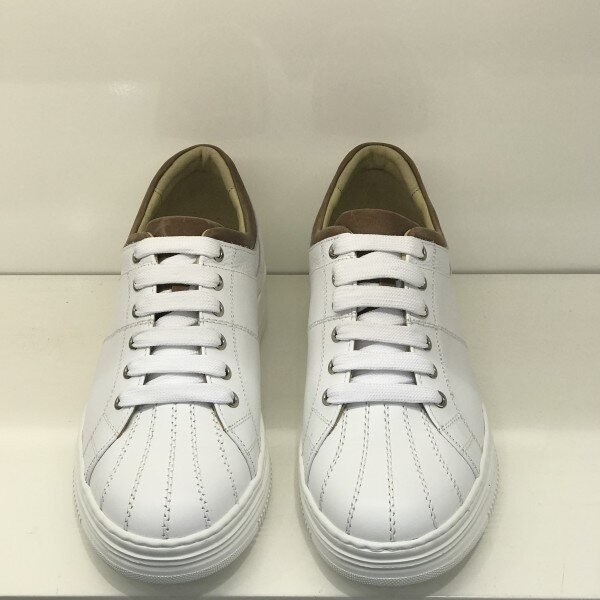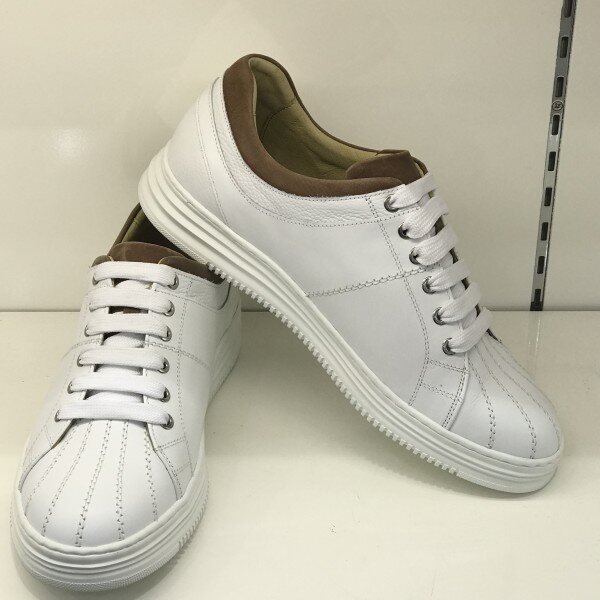 <스니커즈 종류는 5MM 작게 주문하는것을 권해드립니다.>소재: 소가죽굽: 2CM 몰드창색상: 화이트앞쪽의 세로 스티치가 포인트인 제품으로 브라운 가죽이 배색되어 들어가 단조로움을 피하면서 깔끔한 느낌을 주는 제품입니다. 몰드창을 사용하여 가벼우면서도 편안함을 느낄수있고 안쪽의 쿠션이 뛰어나 장시간 착화하셔도 발에 무리가 덜합니다.