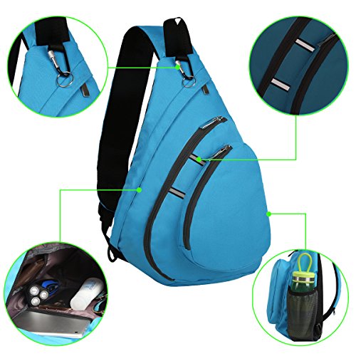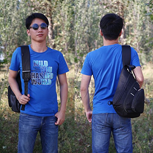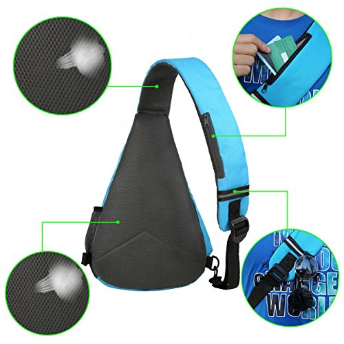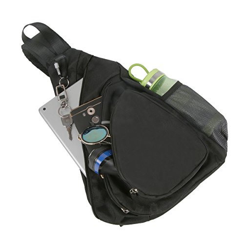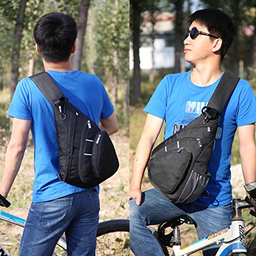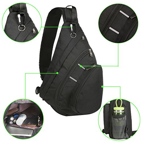 -. Feature : ① Versatile 2 Ways Carrying Chest Bag for Men & Women - Sling pack (chest-back, left-right sling) + hand carry sling day bag. / ② Roomy Space - 16.1x12.2x4.7 inch roomy space with multiple compartments ( TOTAL 7 POCKETs ). Laptop divider in the main compartment fit in a tablet size up to 9.7" iPad. / ③ Quality Zippers - Equipped with premium metal zippers, no worry about fabric be caught. / ④ Humanity Design - 2 reflective stripes on the front pocket + 1 on the strap, will be a good attention to drivers, keep you cycling or walking safely in the darkness. / ⑤ What's you get - 1 x sling pack, 1 x free key chain