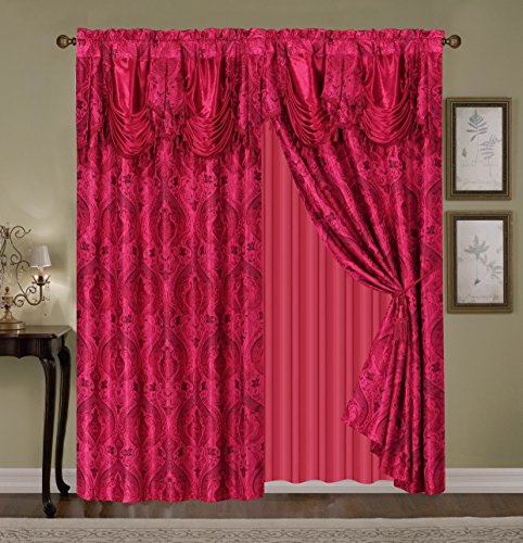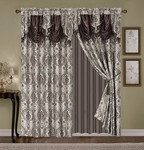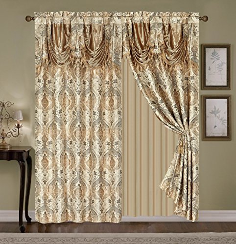 Luxury Embroidered Curtain Set. 4 Piece Drapes with Backing & Valance & Tie Backs