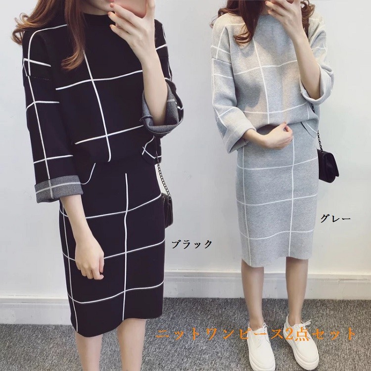 商品説明ニットワンピース セットアップ レディース上下セットチェック柄 ニットセット ニットセーター スカート 2点セット チュニック 大人エレガント カジュアル 着やせ 秋冬カラー: グレー、ブラック素材:ポリエステルセット内容:トップス+スカートサイズ:フリー「単位cm」トップス: 肩幅35 袖長45 バスト110 着丈46スカート: ウェスト〜100 ヒップ〜100 着丈57