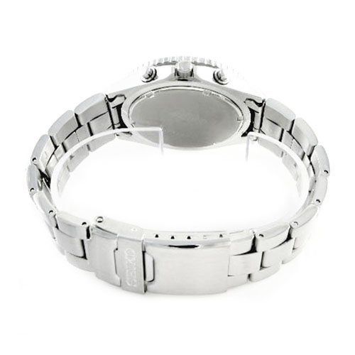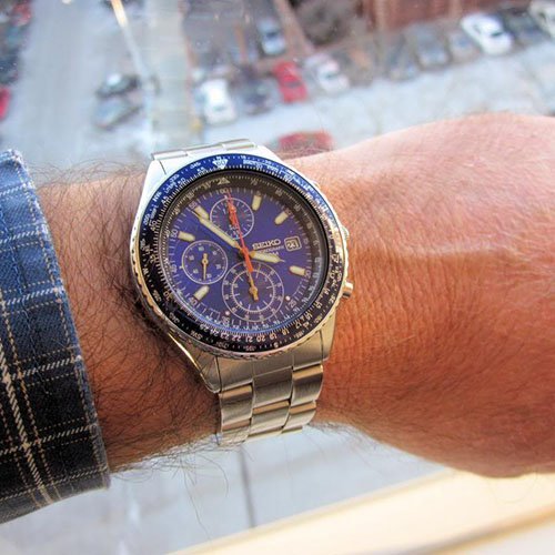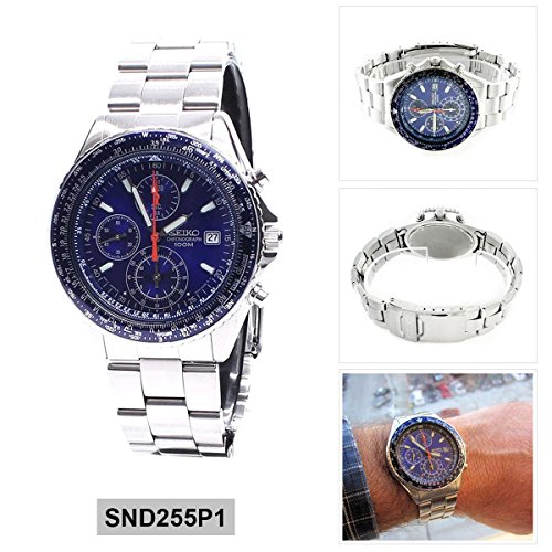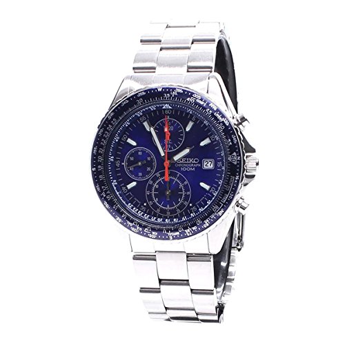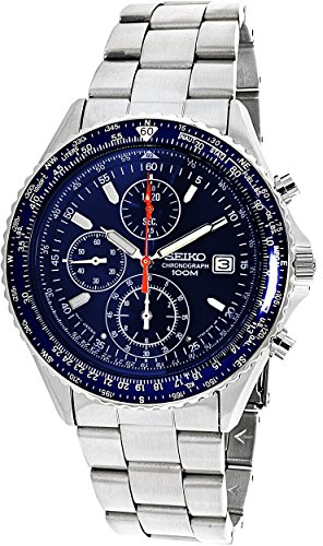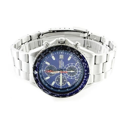 This Seiko is a sophisticated quartz pilot-style chronograph with stopwatch functions (1/20 sec to 60 minutes), and a 12-hour totalizer. The bezel contains a slide rule and a compass scale. The stainless steel case measures 41mm in diameter and it has a solid screw-in back. The luminous lumibrite markers and hands are easily viewable on the blue dial. Includes a blue slide rule-compass bezel, date window, a red seconds (activates with stopwatch function), and a Seiko stainless steel bracelet with a deployant closure. The rotary-type slide rule can be used to convert units and calculate essential flight data, speed or fuel consumption. The watch is 100 meter water resistant. Comes with a stainless steel bracelet with a push-button deployant clasp. Includes a Seiko Box. Features Movement: Seiko Caliber 7T92 quartz chronograph Case: Brushed stainless steel, 41mm x 10mm thick. Back: Solid screw-in back Crystal: Hardlex Mineral Band: Stainless steel bracelet with deployant clasp. 20mm lug Water Resistant: 100 meters Warranty: 2 YearsFeature