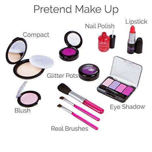 COMES COMPLETE WITH PRETEND MAKEUP: Red Nail Polish, Pink Blush, Pink and Purple Glitter Pots, Compact with Applicator, 4 Slot Eye Shadow, Red Lipstick (goes up and down like real lip stick), 3 Brushes - all these Toy Sized and Little Cosmetics Items that emulate the real stuff!