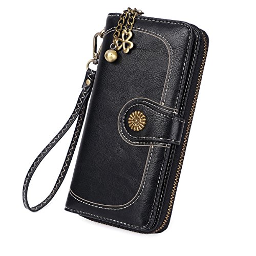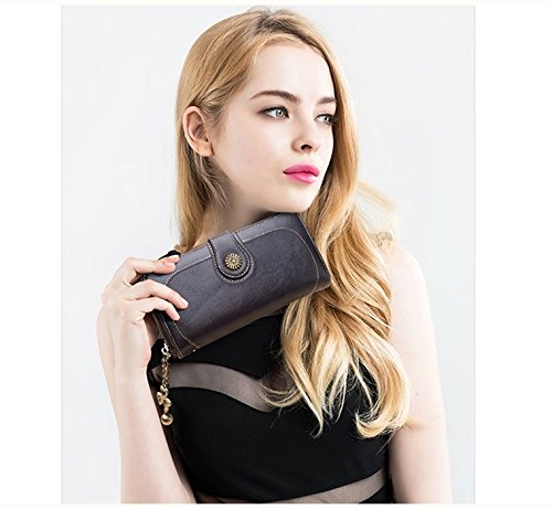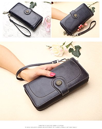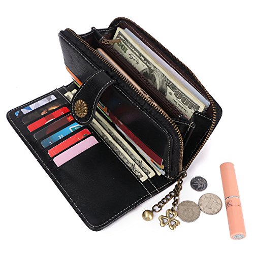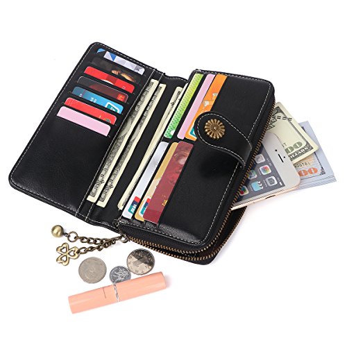 - FUNCTIONAL DESIGN - 11 credit card slots,1 zipper pocket for change,4 currency pockets, this wallet is suitable for cash, coins, cell phone like as iphone 8 plus, passport, pen, checkbook and with a removable wrist strap.