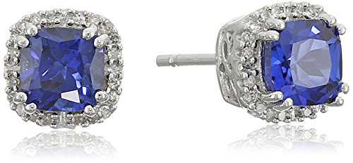 -. Title : 10k White Gold Created Blue Saphire Cushion with Diamond Stud Earrings(1/10 cttw, I-J Color, I2-I3 Clarity)