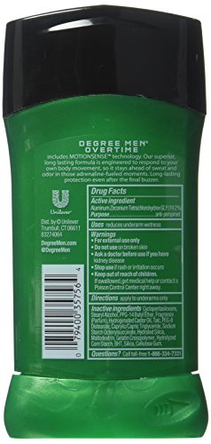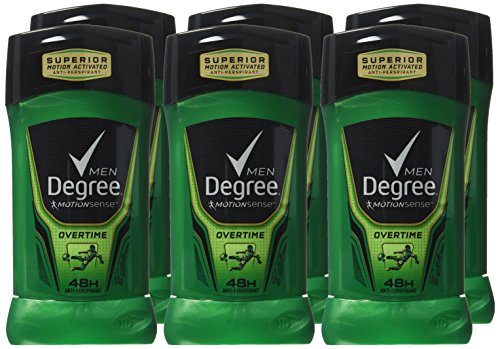 -. Binding : Health and Beauty -. Brand : Degree Men -. EAN : 0079400357564 -. Feature : Degree Men MotionSense Antiperspirant & Deodorant - Overtime 2.7 oz features a masculine scent of fresh citrus fragrance / Superior Motion Activated Protection / Only Degree MOTIONSENSE technology keeps you fresher with every move / The more you move, the more it protects / Helps keep you fresh and energized / Pack of six, 2.7 Ounce each (Total of 16.2 Ounces) / Includes patented motion sense technology for motion activated protection / 48 -hour wetness and odor protection / Responds to your body's movement to stay ahead of sweat and odor / Degree men adrenaline series also available in sport defense, adventure, Everest, extreme, ironman, and cool rush -. IsAdultProduct : 0 -. Label : Unilever -. Manufacturer : Unilever -. MPN : 079400357564 -. NumberOfItems : 6 -. PackageQuantity : 6 -. PartNumber : 079400357564 -. ProductGroup : Beauty -. ProductTypeName : BEAUTY -. Publisher : Unilever -. ReleaseDate : 2014-05-12 -. Studio : Unilever -. Title : Degree Men Antiperspirant, Overtime 2.7 Oz (Pack of 6) -. UPC : 079400357564