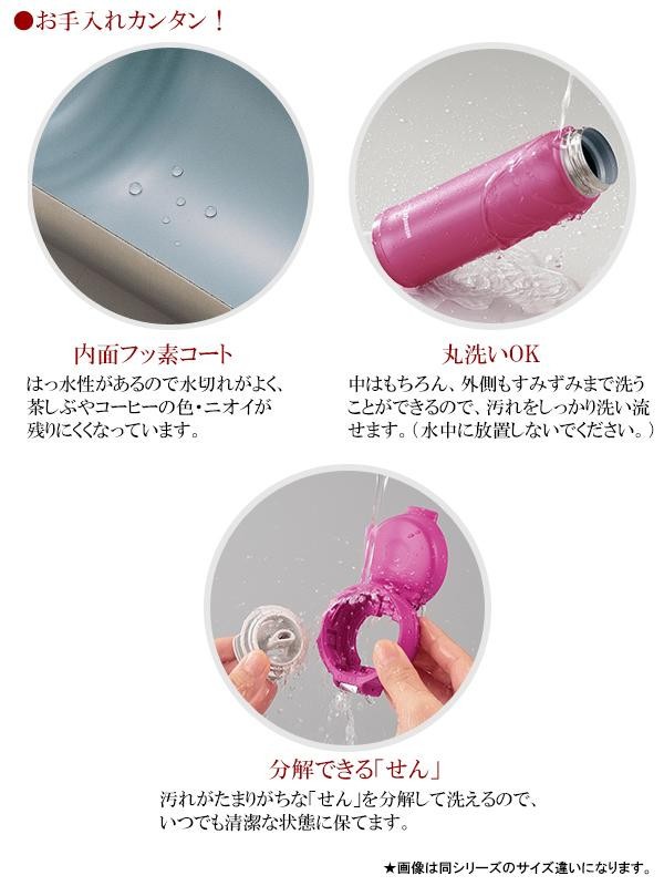 | 仕様 | 実容量:0.36L 保温効力:6時間後67度以上、1時間後86度以上 保冷効力:6時間後9度以下 ワンタッチオープンタイプ 食洗機、乾燥機使用不可 |