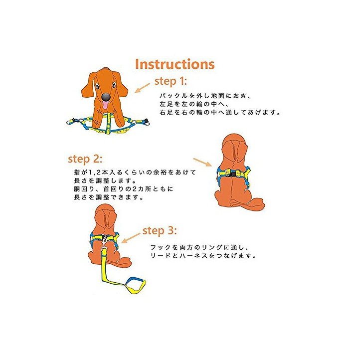 S사이즈:2~6kg까지의 개에게 적합합니다.리이슈의 길이는 120cm에,폭은 1cm입니다.하네스의 동주위가 23~33cm에