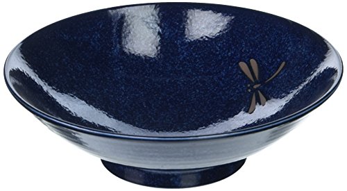 3 pc Japanese Large dinner serving bowl set. 9.5"D x 3.5"H. Classic porcelain salad plates are glazed in dark blue with Dragonfly pattern. Made in Japan.