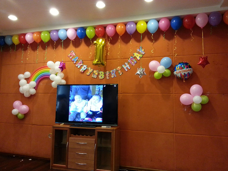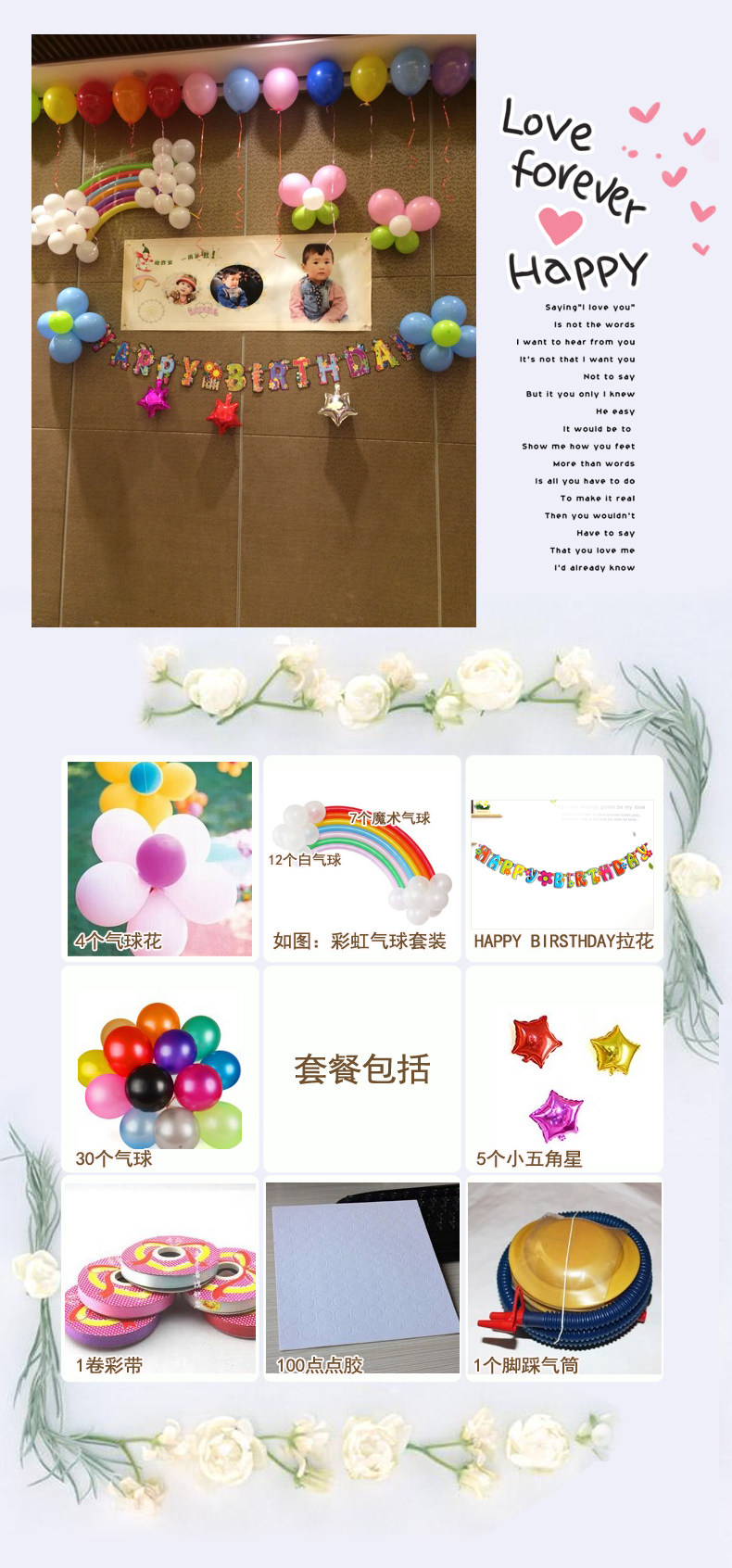 4 balloon flower, balloon rainbow suit, HAPPY BIRSTHDAY garland, 30 balloons, five small five-pointed star, a roll of ribbon, 100 little glue, a foot pump