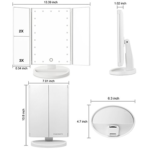 FASCINATE Lighted Makeup Mirror with 21 LED Lights Touch Screen Dimming, Tri-Fold 3X/2X/1X Magnification 180 Degree Rotation Vanity Mirror