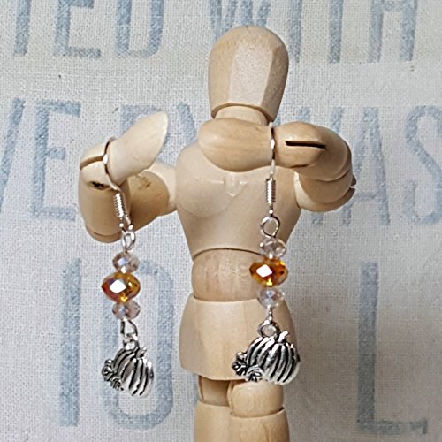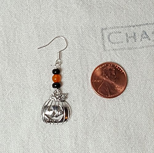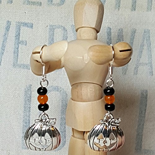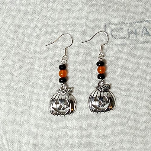 -. Title : Silvertone Jack o' Lantern Earrings with Orange and Black Bead Accents