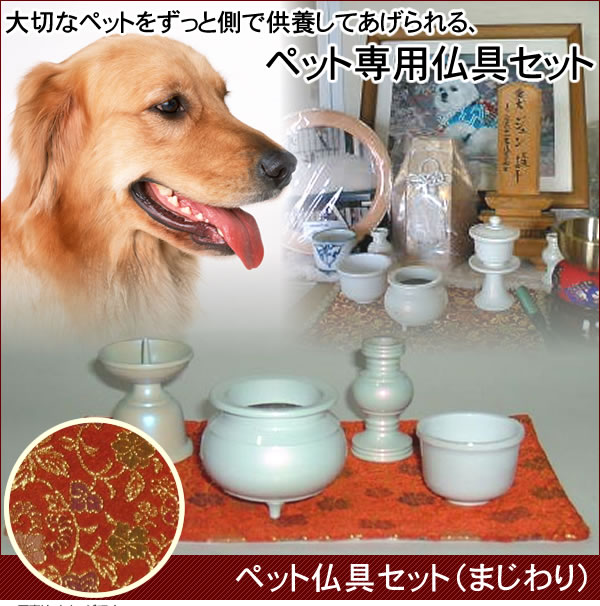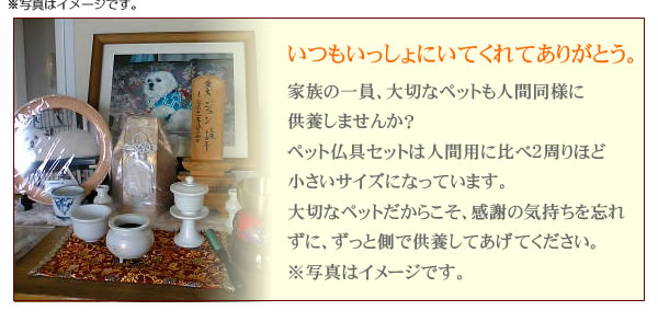 | 家族の一員、大切なペットも人間同様に供養しませんか?ペット仏具セットは人間用に比べ2周りほど小さいサイズになっています。大切なペットだからこそ、ずっと側で供養してあげてね。 |