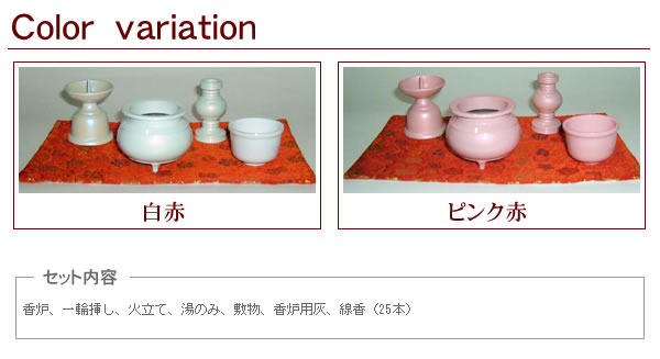 | セット内容 | 香炉、一輪挿し、火立て、湯のみ、敷物、香炉用灰、線香(25本) |
