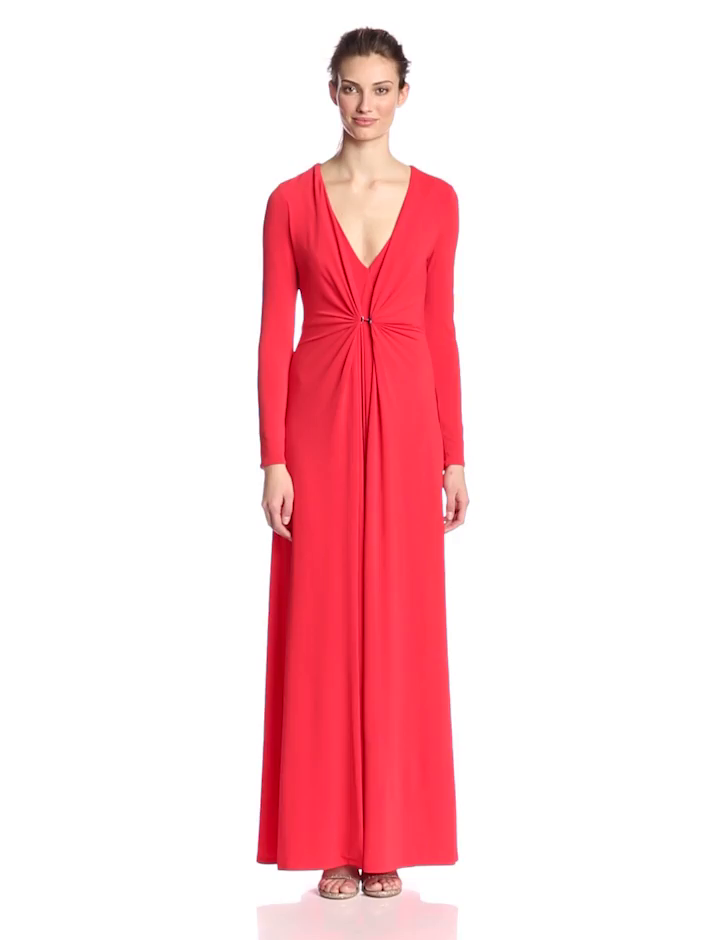 Long-sleeve gown in floor length featuring top layer gathered with logo hardware at center front waist
