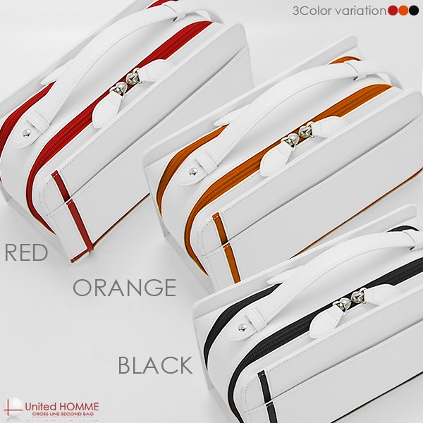 ユナイテッドオム United HOMME ホースハイド×クロスラインダブルファスナー BOX セカンドバッグ ハンドバッグ UH-2175WRD ホワイト×レッド  商品仕様:W26cm×H14cm(持ち手含まず)×D11cm ホースハイド(馬革)※表面/後面、フェイクレザー(合成皮革※側面/底面/ライン部分 なし