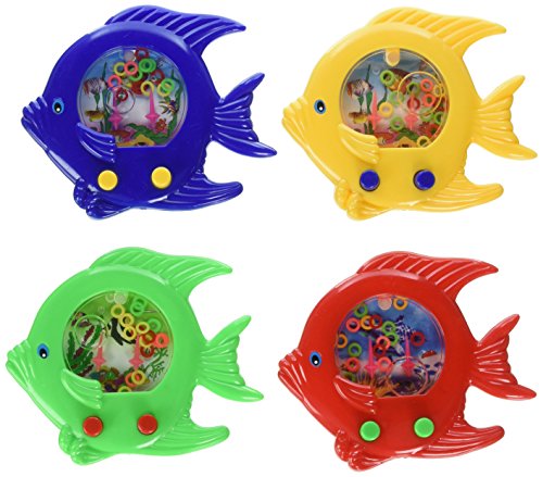 One Dozen fish themed handheld water games. Each toy is approximately 5 inches. These are perfect as party favors or giveaways. The classic water ring game in a fish theme featuring bright attractive colors and a perfect carry along size. Children or adults can improve their fine motor skills. Colors may vary.