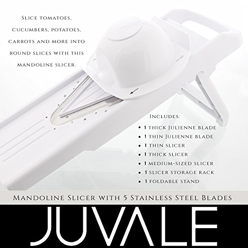 - REDUCE MEAL TIME PREPARATION: With this fantastic slicer set containing everything you'll need to get your food slicing game up to scratch! Includes 1 thick Julienne blade, 1 thin Julienne blade, 1 thin slicer, 1 thick slicer, 1 medium-sized slicer, and 1 slicer storage rack, 1 foldable stand with non-sliding feet and a food guard for safety