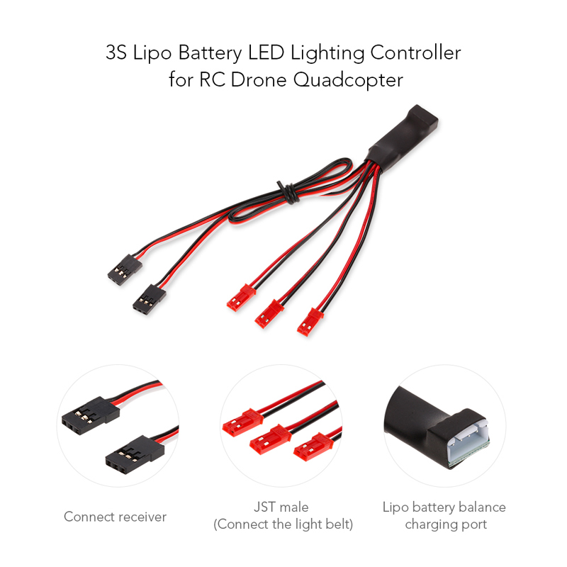 Connecting way: One connector of the controller connects the signal to the receiver, another connector connects to the lipo battery balance charging port, JST connector connects to the LED light strip, your four LED lights would all be lit.