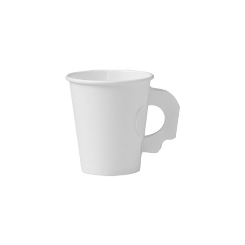 -. Feature : Disposable 6 oz. white paper hot cup with handle for serving hot beverages / Polyethylene lining for resistance to leaking and moisture penetration / Handle for gripping and protection of hands from heat generated by hot beverages / Rolled rim for rigidity and strength / Measures 3.2" x 2.9"