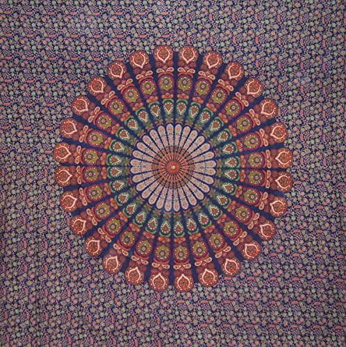Studio : India Arts Publisher : India Arts Binding : Kitchen Product Description SANGANEER TAPESTRY ~ Gorgeous King size Sanganeer tapestry in a mandala peacock circle surrounded by a lovely floral vine pattern. Made of 100% power-loomed cotton offering a strong, tight, durable weave. Measures approximately 110 x 110 inches. Can be machine washed separately on cool gentle and tumble dried. Lovely bright colors of green, red, orange and beige on navy blue. A lovely quality with endless versatility. Purchase pillow shams to match for a great ensemble. Your Sanganeer tapestry can be used for: ~FURNITURE COVER~BEDSPREAD~~TABLECLOTH~BEACH BLANKET~ ~ROOM DIVIDER~A GREAT AFFORDABLE GIFT~~HANG THEM ON YOUR WALL OR CEILING~! We hope to inspire your imagination creativity~:-) 0