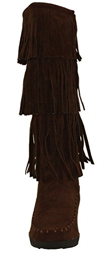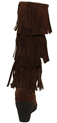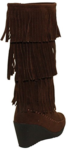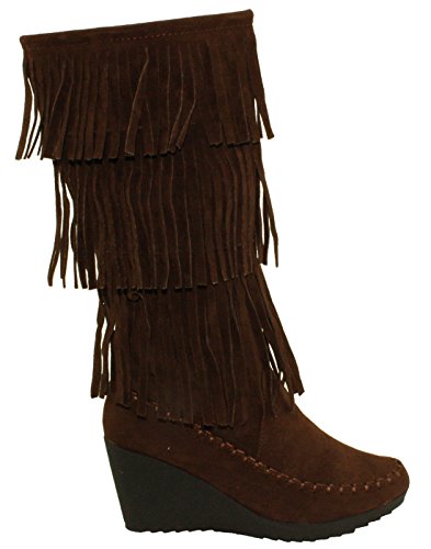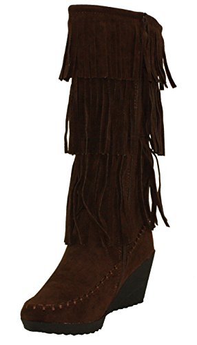 Product Descriptionwomen's mid-calf wedge boots, faux suede upper, triple-layer fringe design on shaft, round toe, moccasin stitching detail, and wedge heel. side zipper closure for easy on/off.0