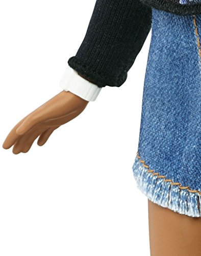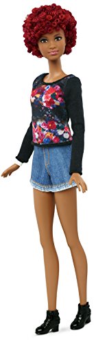 Barbie Fashionistas doll includes a black top with floral print and denim fringe shorts.