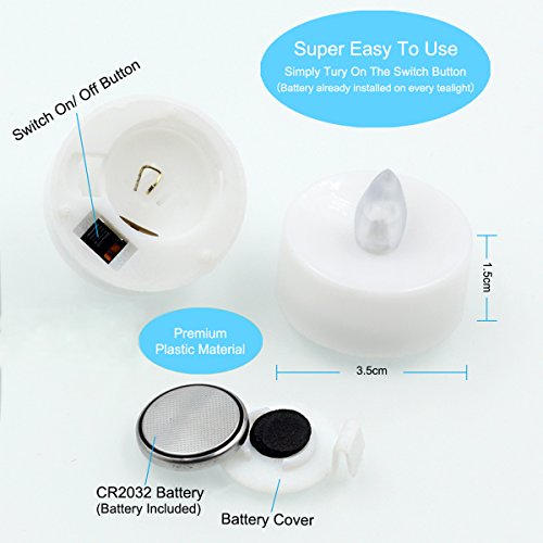 ★ EXTREMELY BUDGETARY,EASY AND HASSLE - FREE - Each Box contains 24 Flameless Tealights.They are an absolute beauty,they are easy to operate,safe and hazard free for any setting and they can be turned on with just a button at the bottom.Not only that, but The Store offers them with the CR2032 batteries already included in each and every Tea light Candle.
