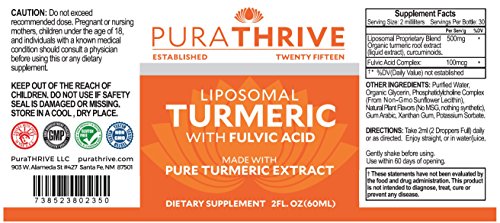 -. Feature : RELIEVE INFLAMMATION AND PAIN QUICKLY AND PERMANENTLY: Exclusive Bioavailable Full-Spectrum Organic Turmeric Supplement extinguishes nagging aches, joint pain, arthritis, and inflammation. Goodbye to the constant pain...engage in the activities you love! Fast, effective relief from arthritis | back pain | hip pain | knee pain | muscle pain | headaches | fibromyalgia... +FREE "Turmeric Miracle Secrets" eBook! 50 pages of amazing info. / UNLOCK THE FULL POWER OF TURMERIC: More Active, Better Bioavailability, Faster absorbed. Liquid Turmeric Extract with Liposomes and Fulvic Acid offers absorption like never before.. Your brain, joints, immune system, mood and energy will benefit. Accept no substitutes, improve your health risk-free with our money back guarantee (see details below) / NATURAL PAIN RELIEF - FEEL YOUR BEST! 100% Pure Organic GMO Free, Made In The USA in an FDA and cGMP certified facility. Gluten, Wheat and Dairy Free, Heavy Metals Free and Prop 65 Compliant for Heavy Metals No Fillers, no additives,. Rest assured with PuraTHRIVE you have found the highest quality, maximum potency, and best delivery system. / UPSET STOMACH? STOP POPPING PILLS NOW - Many people suffer with heartburn, indigestion, and discomfort caused by Turmeric Curcumin capsules and powders. PuraTHRIVE's Unique Organic Liquid Turmeric Curcumin Formula Tastes Great and it's easy to digest. The liposomes and natural fulvic acid make it bio-active...so you'll feel great! / SEE THE BENEFITS OR YOUR MONEY BACK - We care about your health, and we want you to Thrive. You are backed by PuraTHRIVE's unconditional commitment to your absolute satisfaction 100% Guaranteed. No questions asked. Take action with confidence. We've got you covered.