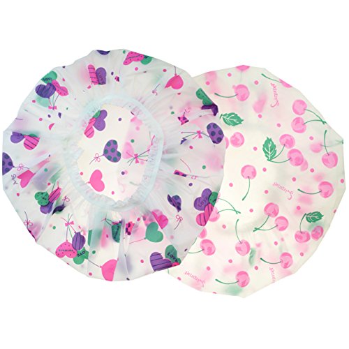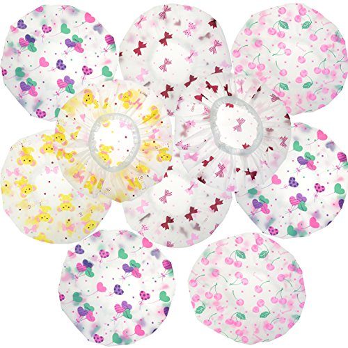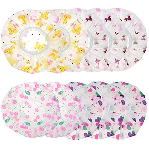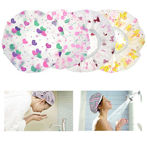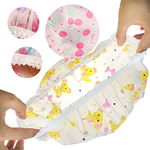 Material:Our product are made of plastics and waterproof stuff-EVA. Wide application: These waterproof hair caps can fit for showering, cooking and SPA, and protect your hair well, or can be applied for tying hair when making up, cleaning face. Fashionable patterns: 4 various patterns for you to choose, brown bowknots, cherries, yellow bear, heart balloon, select one and enjoy your shower time.