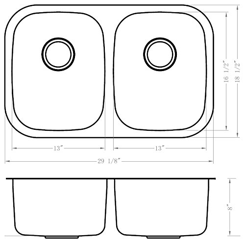 Exterior dimensions: 29" (wide) x 18-1/2" (front-to-back) | Interior bowl dimension: 13" x 16-1/2" (left) , 13" x 16-1/2" (right) | Bowl Depth: 8" | Standard 3.5" drain openings will fit any garbage disposal unit