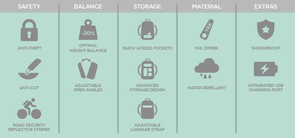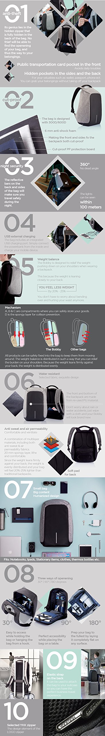 Multifunctional backpack with security, blade cut and water repellent function.