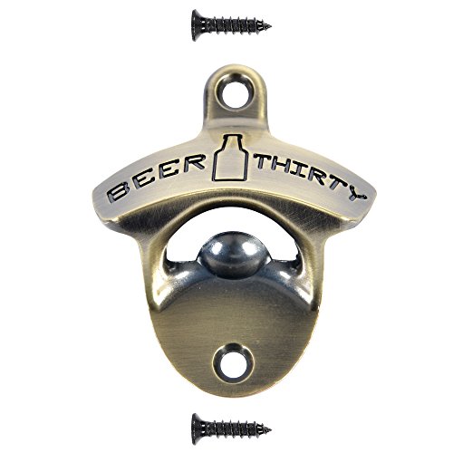Barware Gear Wall Mounted Bottle Opener Beer Thirty with Free Stainless Steel Mounting Screws. Pop the cap and open your Beer and Soda in Style. Wall Hung Beer Opener for Bar or Kitchen. Antique Brass