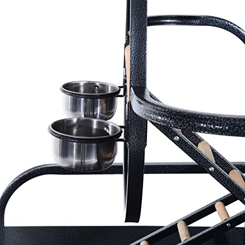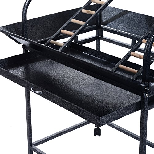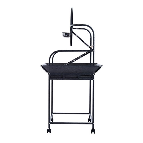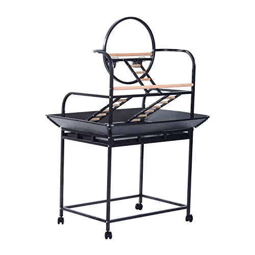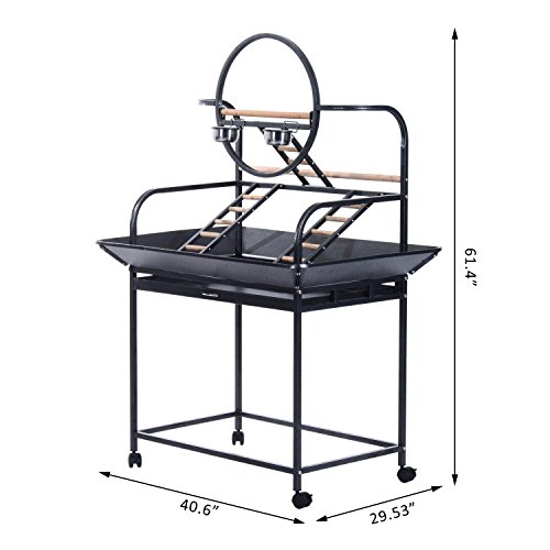 -. Binding : Misc. -. Brand : Pawhut -. Color : Black -. EAN : 0763250271780 -. Feature : Solidly built with stainless steel, powder coated metal and fir wood construction for durability / 30" wide, high-edge tray helps contain potentially messy situations / Metal play ring in center, multiple wooden perches for resting plus 2 stainless steel bowls for food and water / 4 universal wheels with brake for easy transport around the house / Overall Dimensions: 40.6"L x 29.53"W x 61.4"H -. Label : Aosom Direct - Lawn & Garden -. Manufacturer : Aosom Direct - Lawn & Garden -. Model : D10-013 -. MPN : D10-013 -. NumberOfItems : 1 -. PackageQuantity : 1 -. PartNumber : D10-013 -. ProductGroup : Pet Products -. ProductTypeName : PET_SUPPLIES -. Publisher : Aosom Direct - Lawn & Garden -. Size : 61" -. Studio : Aosom Direct - Lawn & Garden -. Title : Pawhut 61" Bird Play Stand with Play Ring - Black -. UPC : 763250271780