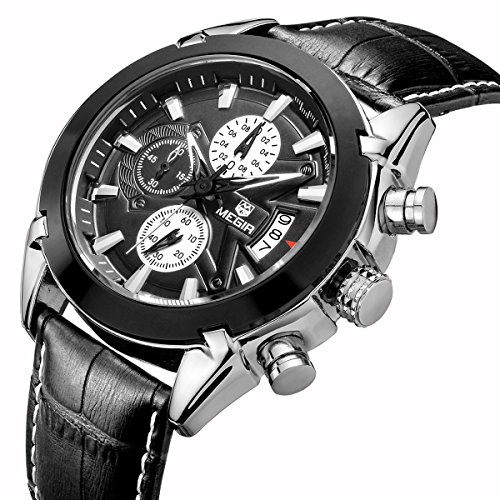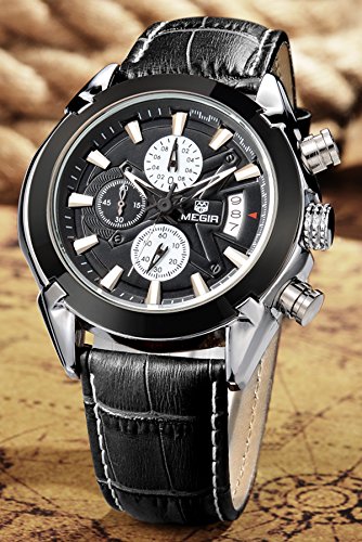 -. Title : Megir Men Black Military Pilot Multifunction Leather Quartz Wrist Watches