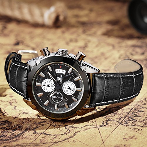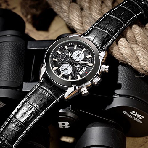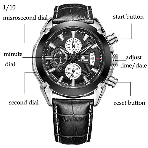 -. Feature : A nice mix of sports and dressy , Elegant Stylish Design , Bold Look and Heavy Watch , Great for casual ues , parties , sports , Best gift for men very cool / Soft Durable Genuine Leather Strap , Provide you comfortable experience , Gorgeous face , Cool hour hand , Easy to read / Professional Japanese quartz movement with analog display , Protective mineral crystal protects watch from scratches / Case diameter : 47MM (1.85") , Case Thickness: 14MM (0.55") , Band Width: 24MM(0.94") , Band Length: 200MM(7.87") , If your wrist is a little small , you need to have more holes on the strap. Function: Calendar , Chronograph(The above is 1/10 chronograph dial, the following is chronograph dial, the left is the minute chronograph dial).Daily Water resistant to 99 feet (30 M): withstands rain and splashes of water, but not showering or submersion / Please notice : the watch packages in simple opp bags and you could see the last picture to set the time or connect with us on amazon