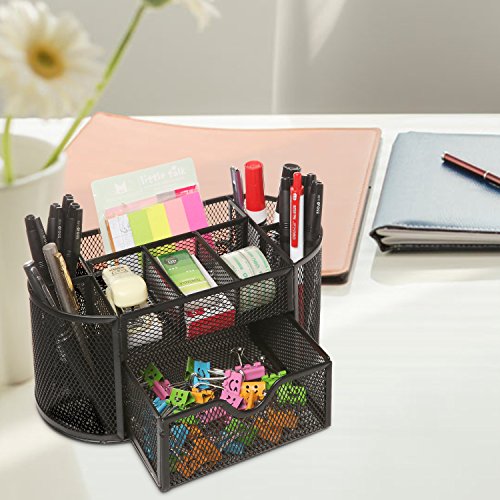 MyGift Space Saving Black Metal Wire Mesh 8 Compartment Office / School Supply Desktop Organizer Caddy w/ Drawer