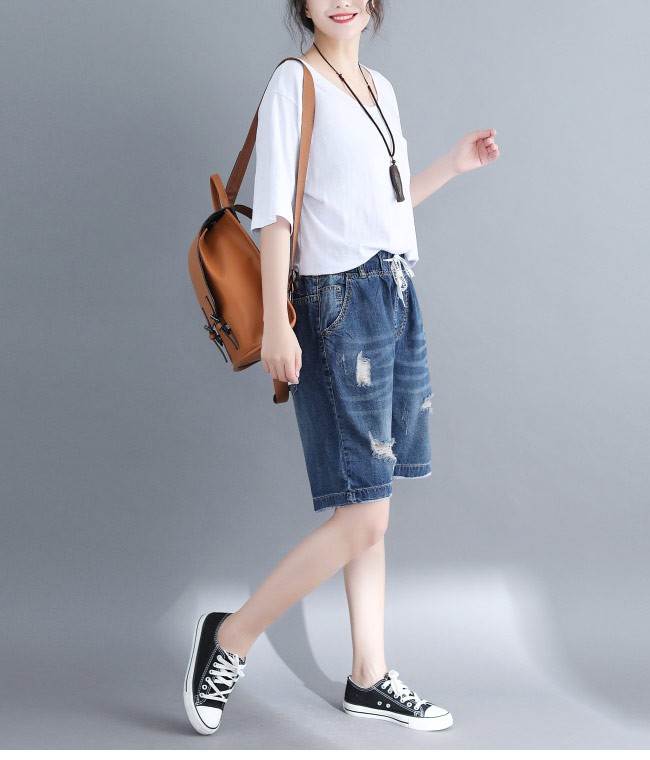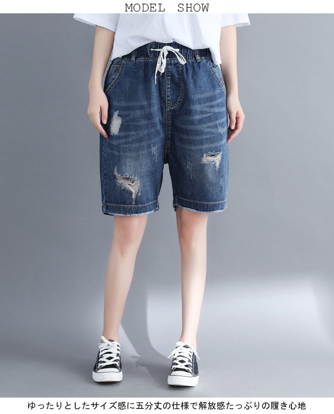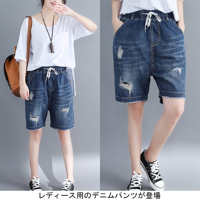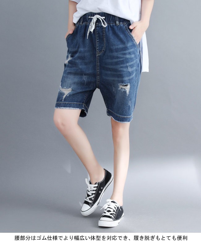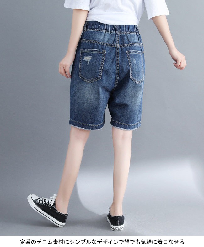 デニムパンツ 五分丈 レディース ハーフパンツ ウエストゴム ワイドパンツ ショートパンツ ジーパン 半ズボン 女性用 ジーンズ ダメージ加工レディース用のデニムパンツが登場ゆったりとしたサイズ感に五分丈の仕様で解放感たっぷりの履き心地腰部分はゴム仕様でより幅広い体型を対応でき、履き脱ぎもとても便利要所要所に施されてたダメージ加工はナチュラルなオシャレ感を作り出す定番のデニム素材にシンプルなデザインで誰でも気軽に着こなせるカラー:写真色素材 綿混紡サイズ(cm) L 2XLL ウエスト(ゴム仕様)64-90 ヒップ110 ワタリ64 総丈512XL ウエスト(ゴム仕様)72-98 ヒップ118 ワタリ68 総丈53ご注意:※サイズは平置きサイズです。素人採寸ですので、若干の誤差がございます、ご了承ください。