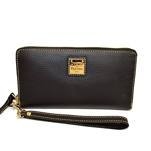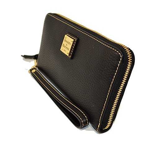 Product Description Dooney Bourke Lg Pebble Leather Zip around Wallet Black Wristlet Phone Clutch Black pebble leather, black smooth leather trim. Lined, several inside c.card and bill spaces. Cell phone space ( holds plus size ) . 3/4 zip closure. 6" removable wrist strap. Gold tone hardware 0