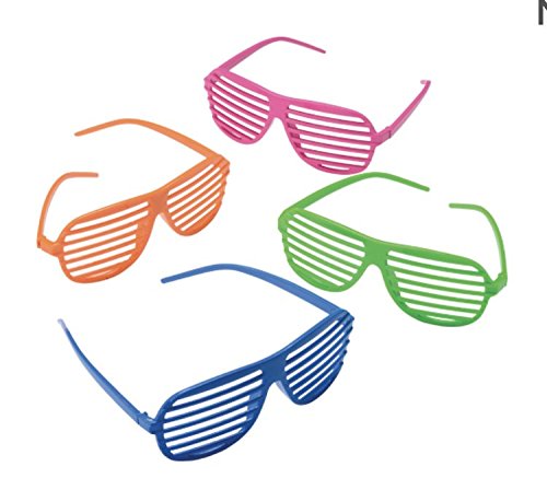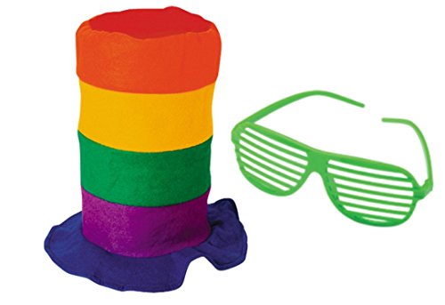 -. Feature : Includes 1 rainbow stove pipe hat and 1 assorted neon shutter glasses / One size fits most adults / Hat measures 11 in. tall and the inside circumference measures 23 in. / Glasses are assorted in neon pink, green, blue, and orange