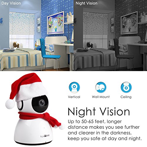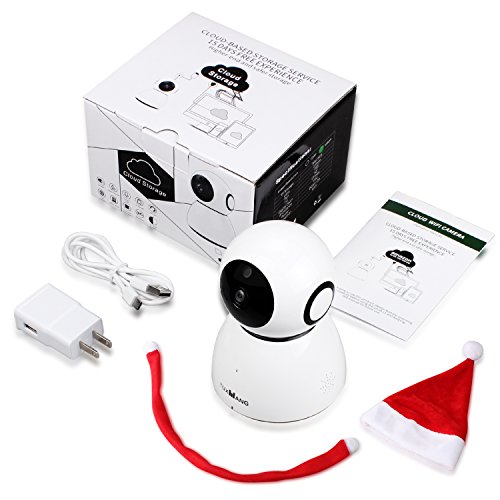 -. Feature : 3 Connecting Ways: 1). Scan QR code to add: make your phone connect to Wi-Fi, and then click "Scan QR code to add", let the camera face the code to connect. 2). Choose a wired network (Only support LAN port device) to connect your Ethernet cable (Not Included) between camera and Wi-Fi router. 3). Connect your phone to a Wi-Fi, please click "Add device" and Choose a Wi-Fi network. Details see manual. Note: It only supports 2.4ghz network. / Support Cloud Storage: Record, store and review footage using a MicroSD card (Maximum 64G, not included) and when the memory full, it will auto cover the oldest video files. Supports 15-day free Cloud Storage to avoid the risk of losing footage from a SD card, ensure all your videos are safe, secure and protected. We provide the most efficient compression and the highest protection of data, so you can be sure that your footage is safe and secure. / 2-Way Audio: The built-in microphone and speaker allow voice communicating between the APP and camera sides. You can talk and listen to your family on mobile device, keep an eye on your baby at any time, whether you want to see his face, hear his voice or let him hear yours. / Features: 1.) 1080P high definition 2Megapixel, providing you the ultimate visual experience with the best image & video recording quality. 2.) Night Vision: With IR night vision, night vision up to 50-65 feet, longer distance makes you see further and clearer in the darkness. 3.) Remote Pan and Tilt: Wide viewing angle of 120 degree. Pan angle: 355 degree; Tilt angle: 55 degree. 4.) Real-time streaming to your phone & activity alerts when motion is detected. / Super Cute Design & Multiple Uses: This monitor designed like a cute small snowman, with the free Christmas hat and scarf, you can decorate it to celebrating Christmas. You can use it for home security monitoring, nanny cam, pet cam and monitoring, elderly persons security, business monitoring.