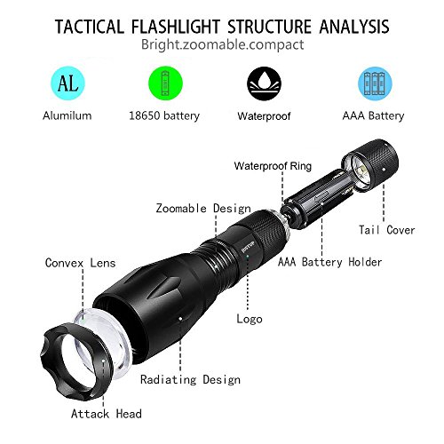- ADVANCED DESIGN:The Tactical Flashlight is made from air-craft Grade light aluminum and can withstand extremes of temperatures, from freezing to boiling. The flashlight is waterproof and shock resistant.