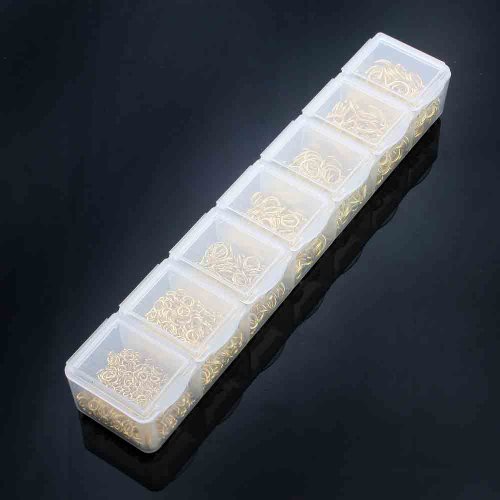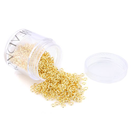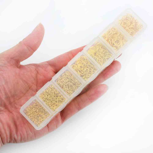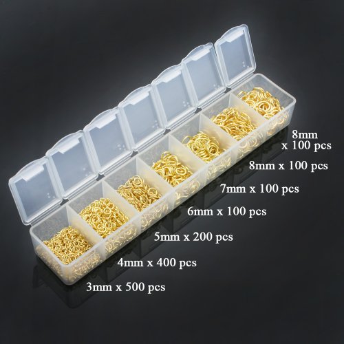 Create unique dangling components for your jewelry, you need a jump ring set. Its open loop shape displays a shiny Gold color. The jump ring box set included: 3mm-500pcs / 4mm-400pcs / 5mm-200pcs / 6mm-100pcs / 7mm-100pcs / 8mm-200pcs. Total 1500 pcs.Feature