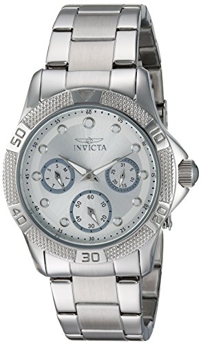 Silver and white metal sunray dial with steel and white hands and hour markers, 60 s, day and date sub dials, steel stainless steel band and push crown